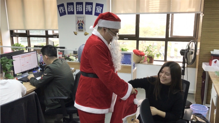 公司為(wèi)大(dà)家(jiā)“請(qǐn><g)”來(lái)了(le)有(yǒu)著(zhe)紅(hóng)帽子(zǐ↓ε↓")和(hé)大(dà)胡子(zǐ)的(de)“聖誕老(lǎo) ♦人(rén)”