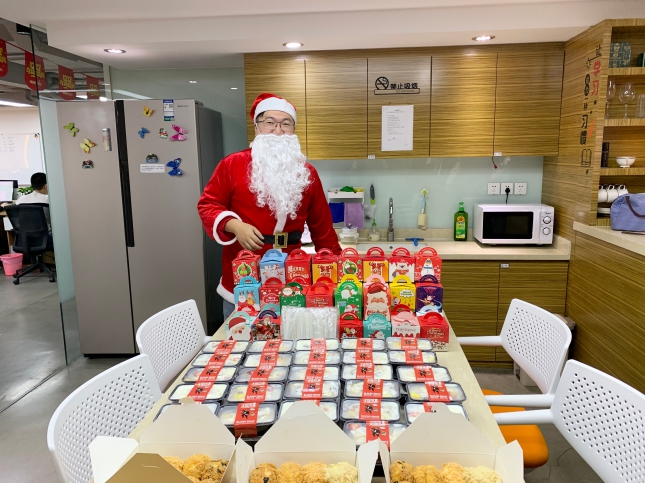 公司為(wèi)大(dà)家(jiā)“請(qǐn><g)”來(lái)了(le)有(yǒu)著(zhe)紅(hóng)帽子(zǐ↓ε↓")和(hé)大(dà)胡子(zǐ)的(de)“聖誕老(lǎo) ♦人(rén)”