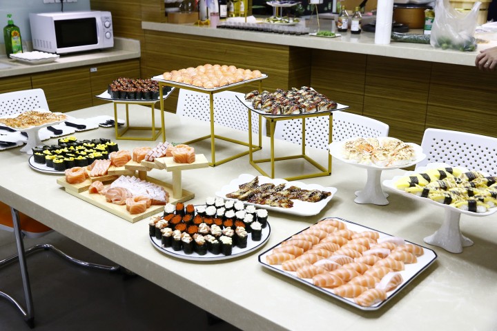 久違的(de)下(xià)午茶,企管中心的(de)小(xiǎo)姐(jiě←φ∑)姐(jiě)們請(qǐng)來(lái)了(le)壽司團隊現(xiàn)>$場(chǎng)制(zhì)作(zuò)新鮮美(měi)味的(de)λ 壽司刺身(shēn),